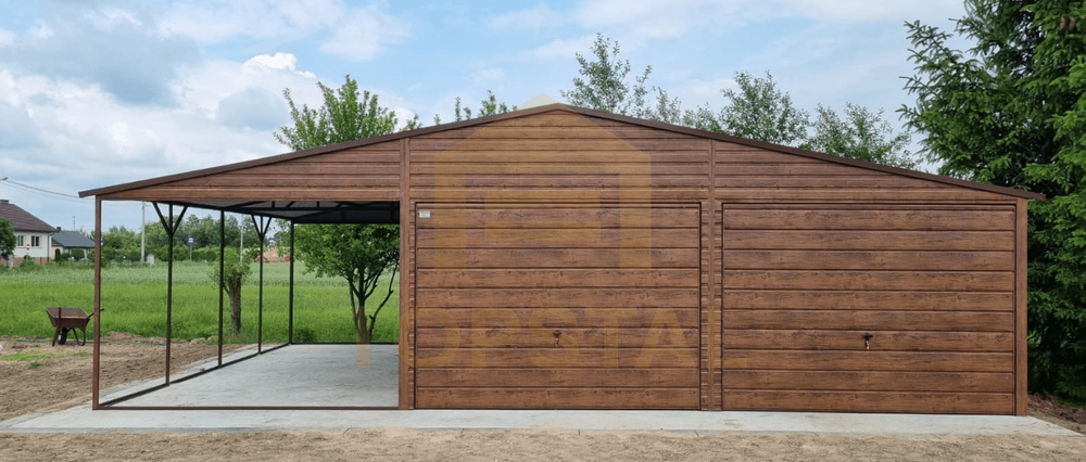 Garaż blaszany 6x5,8 DREWNOPODOBNY + 3m WIATA